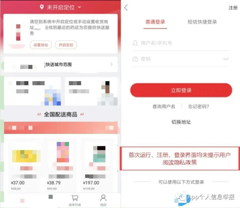 案例1:某医药平台App在启动、登录、注册界面未以显著方式提示用户阅读隐私政策。