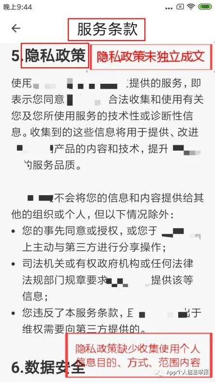 案例7:某协同办公App将隐私政策夹杂在服务条款中,且未在隐私政策中逐一描述收集使用个人信息的类型、目的等规则。