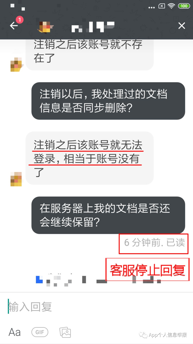 案例8:某协同办公App功能界面、客服电话、电子邮箱等各渠道均无法要求删除文档、个人信息等数据。