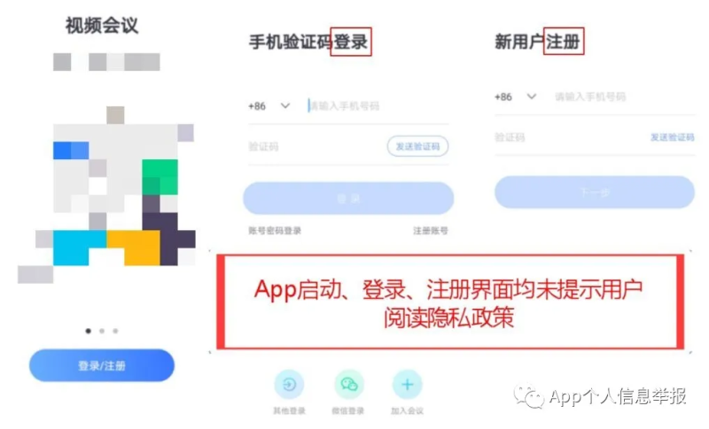 案例9:某网络会议App启动、登录、注册界面均未提示用户阅读其隐私政策。