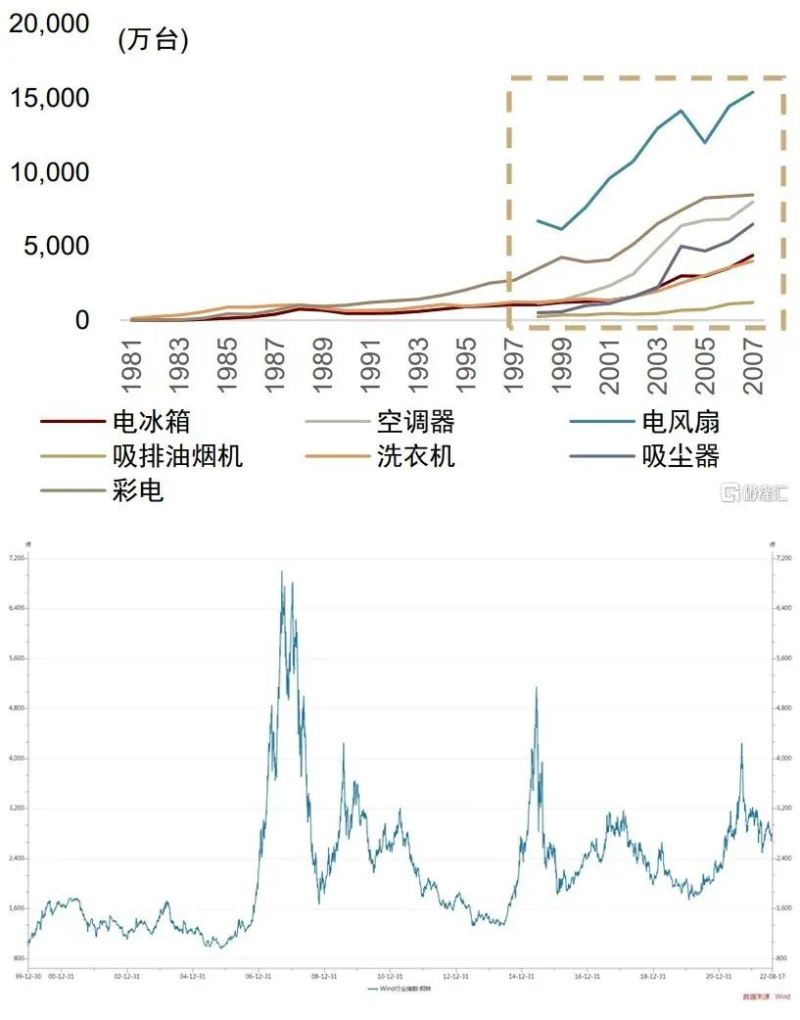 ▲图:我国主要家电1981-2007年产量(上)和万得钢铁行业指数(下)