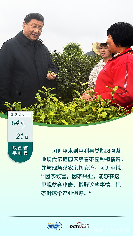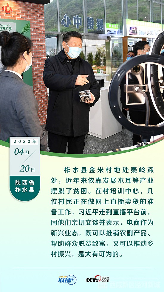 联播+4月20日至23日,习近平总书记在陕西考察。在柞水县小岭镇金米村,习近平站在网络直播平台前为老乡“带货”;在老县镇蒋家坪村的茶园里,他叮嘱茶农把茶叶这个产业做好。这些生动的细节的背后,正是总书记关切的扶贫大战略。