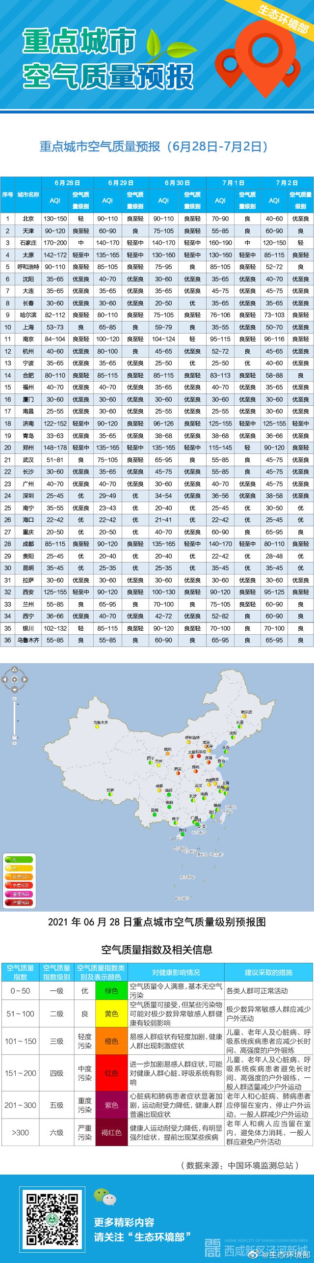 6月28日-7月2日36个重点城市空气质量预报 ​​​ ​​​​