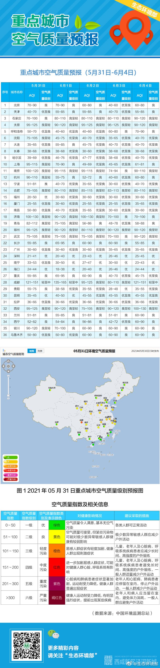 5月31日-6月4日36个重点城市空气质量预报 ​​​​
