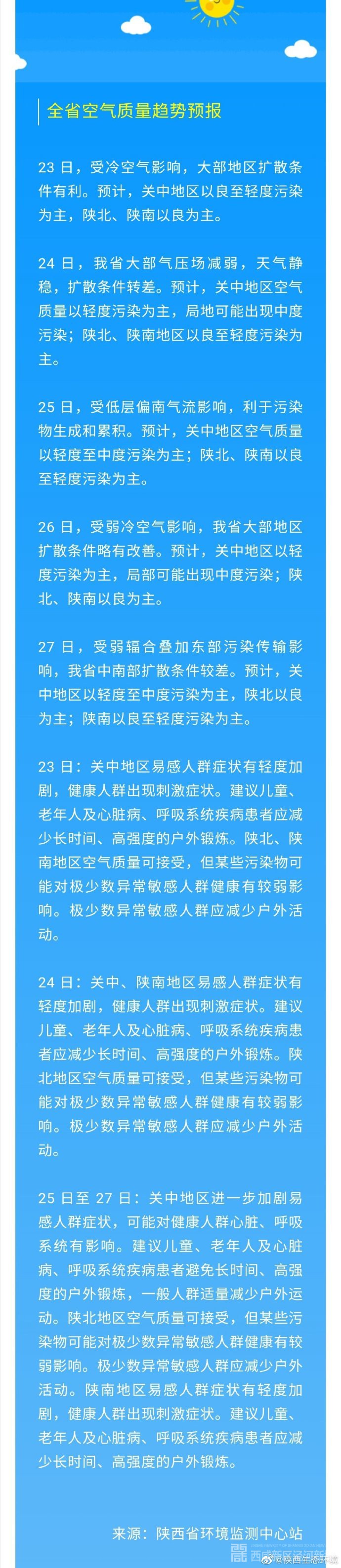 23 日,受冷空气影响,大部地区扩散条件有利。预计,关中地区以良至轻度污染为主,陕北、陕南以良为主。24 日,我省大部气压场减弱,天气静稳,扩散条件转差。预计,关中地区空气质量以轻度污染为主,局地可能出现中度污染;陕北、陕南地区以良至轻度污染为主。
