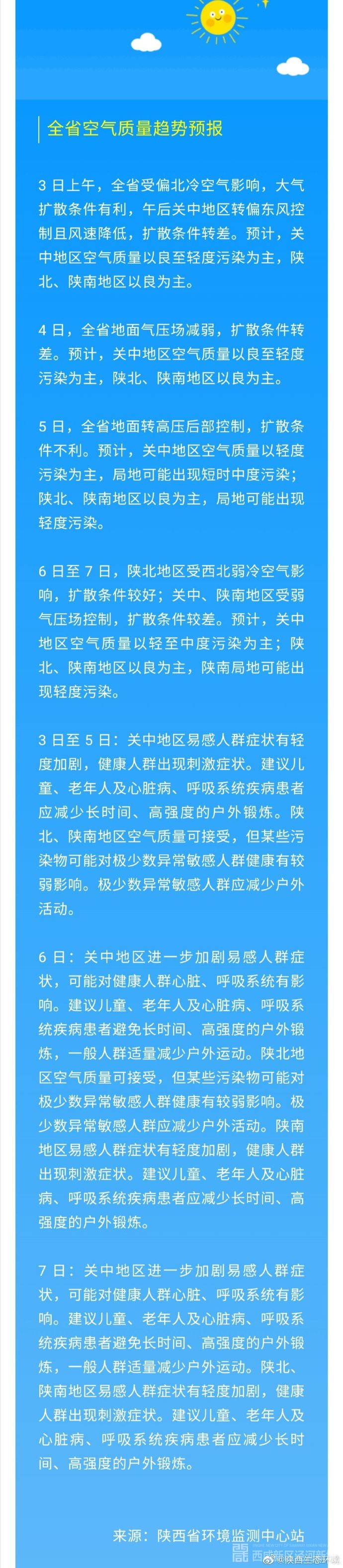 3 日上午,全省受偏北冷空气影响,大气扩散条件有利,午后关中地区转偏东风控制且风速降低,扩散条件转差。预计,关中地区空气质量以良至轻度污染为主,陕北、陕南地区以良为主。4 日,全省地面气压场减弱,扩散条件转差。预计,关中地区空气质量以良至轻度污染为主,陕北、陕南地区以良为主。