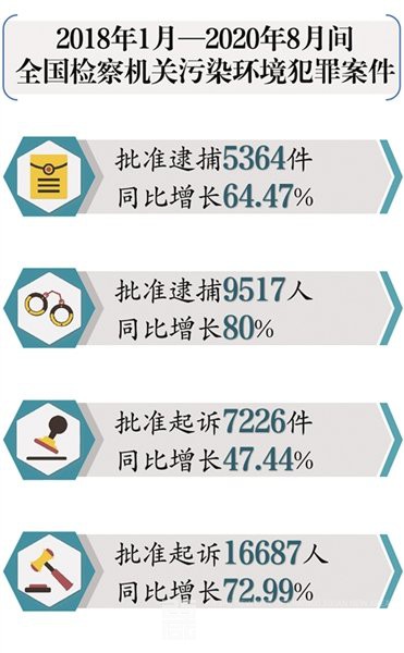 随着国家环境治理力度不断加大,刑事法律对环境犯罪的规制不断加强,全国污染环境犯罪案件查处数量总体呈明显上升趋势,2018年1月-2020年8月间,全国检察机关共批捕污染环境犯罪案件5364件9517人,同比分别上升64.47%和80%;起诉7226件16687人,同比分别上升47.44%和72.99%。