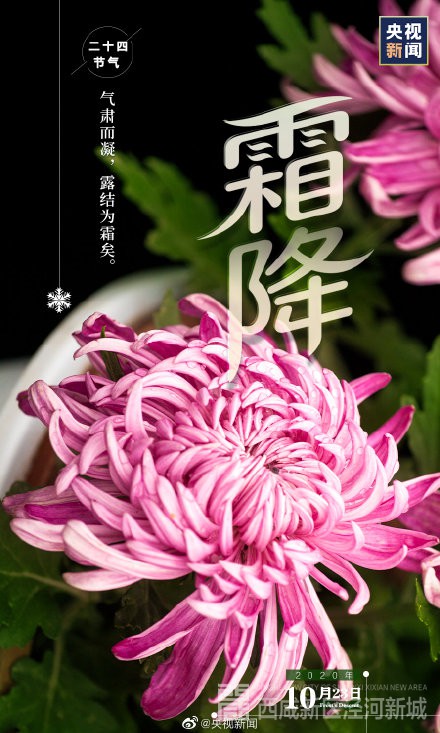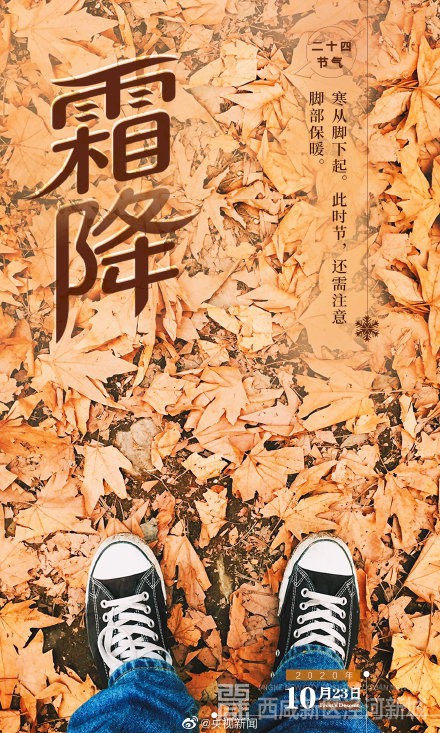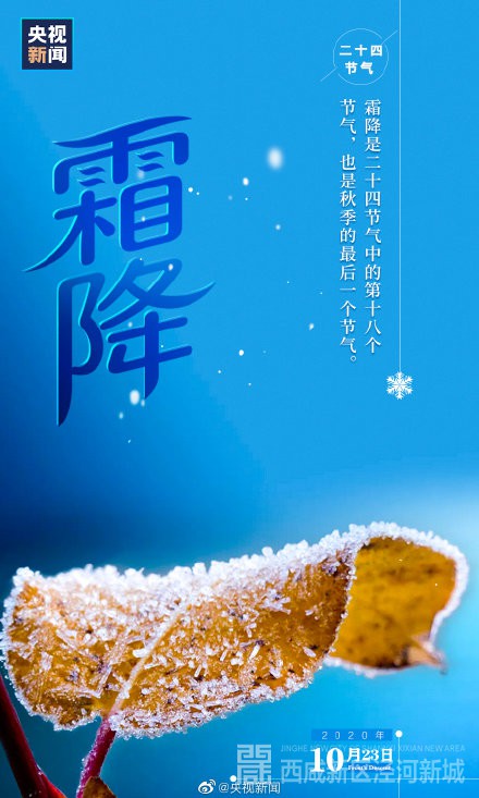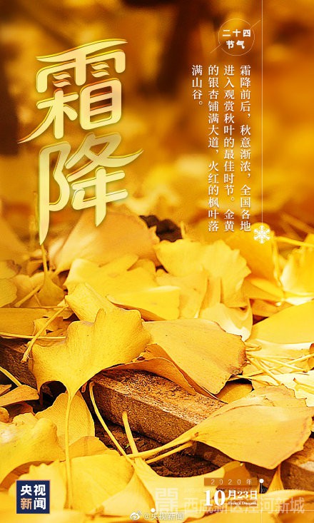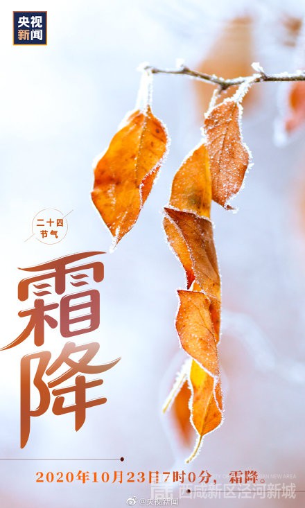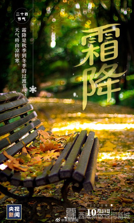 今天7时,霜降至。“气肃而凝,露结为霜”,霜降是秋向冬过渡的开始。“寒露不算冷,霜降变了天”,霜降后天气逐步向冬天靠近,应适时增加衣物,注意下肢、腹部、足部保暖,老人孩子更要注意。霜降时节,天高云淡,枫叶尽染~一起迎接!
