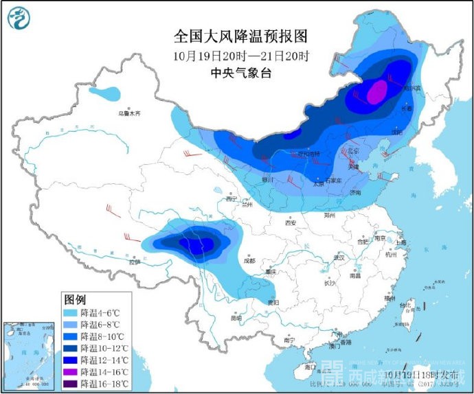 预计,10月19日20时至21日20时,受较强冷空气影响,新疆东部、甘肃河西、青海南部、西北地区东北部、东北地区中西部、华北、黄淮北部、西藏东部、西南地区北部等地的部分地区平均气温将下降4~6℃,其中,内蒙古大部、东北地区西部、华北北部、西藏东北部、四川西北部等地降温幅度可达8~12℃,局地14℃。上述部分地区并伴有4~6级风,阵风7~8级,其中,内蒙古西部阵风可达9级(见图1)。中央气象台10月19日18时发布大风降温预报。20日白天甘肃西部、内蒙古西部、宁夏北部等地的部分地区有扬沙天气,内蒙部西部局地有沙尘暴;内蒙古东部、黑龙江西部、青海南部、川西高原北部等地部分地区有中到大雪、局地暴雪。