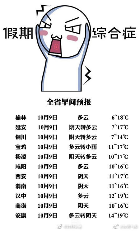不想努力,不想上班。快来,让我们开启元气满满的一天。预计今天白天:全省阴天间多云,其中关中大部、陕南西部局地有小雨或阵雨。今天晚上:全省阴天间多云,其中关中西部、陕南南部有小雨或阵雨。