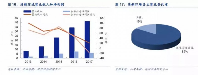 外延并购进入非电领域,寻找新增长点。2016年,公司与中国铝业共同投资设立铝能清新,推动公司进入有色行业等非电领域。2017年1月,清新环境用1.3亿现金收购博慧通80%股权,切入石化非电烟气治理市场。从大机组到小机组再到非电行业的自备电厂,2017年是公司第一年专注在非电领域,2018年将持续推进。目前公司已经向非电领域比如钢铁、石化、碳素、有色等行业进行拓展,将SPC-3D技术及其他现有技术进行适应性改进,并对非电行业氮、硫、尘污染物之外其他污染物指标的要求进行相应配套改进,以达到排放标准。目前公司在非电领域的多个细分行业都在积极推进示范项目建设和客户对接工作。