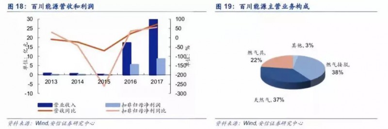 百川能源是京津冀地区燃气龙头,主营燃气销售、燃气接驳与燃气具销售。公司地处京津冀核心区,区位优势明显。公司特许经营区域范围覆盖河北省廊坊市的永清县、固安县、香河县、大厂县及三河市6个县市,以及张家口市涿鹿县、天津市武清区;特许经营区域覆盖居民人口超过400万,工商业用户过万家。京津冀一体化带来的持续人口流入为公司燃气业务的长期增长打下坚实基础。随着京津冀煤改气的快速推进,公司接驳收入大幅提升,从2016年的7.86亿上升到2017年的11.34亿,同比增加44.3%,成为公司业绩快速增长的引擎。