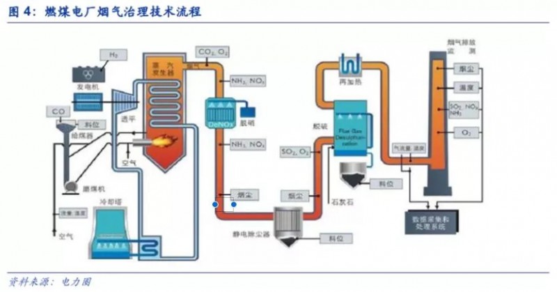工业源废气污染主要来自于化石燃料的燃烧,关键污染物包括二氧化硫、氮氧化物、粉尘等。不同工业源废气的治理方式根据其污染物种类而存在着一定的差异。以最为典型的燃煤电厂为例,其烟气治理步骤包括脱硝、除尘、脱硫三个环节。