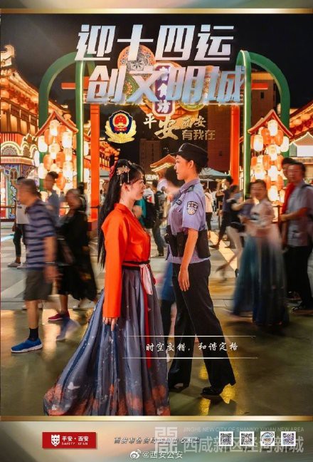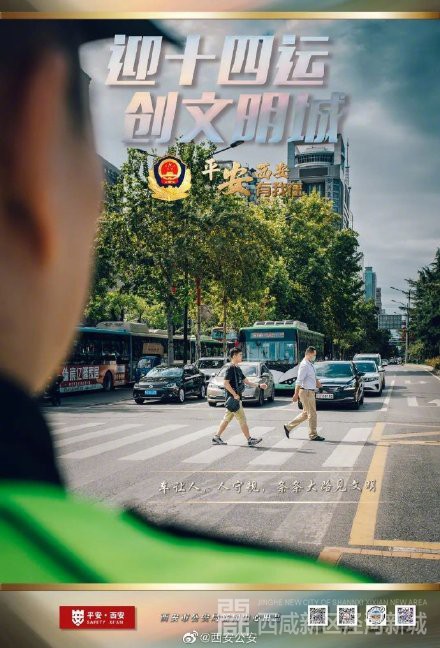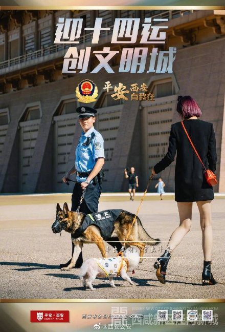 为迎接全国第十四届全运会,努力打赢创建全国文明城市攻坚战,西安市公安局推出了“迎十四运,创文明城,平安西安有我在”系列宣传海报。此次推出的宣传海报,共有十张,内容主要包括:“文明交通”、“文明养犬”、“未成年人保护”、“十四运安保”、“守护平安”等多个主题。大明宫遗址公园、大唐不夜城、南门、西安奥体中心等拍摄地点的选择,展现了西安的城市风貌和厚重历史;“车让人、人守规”、“牵绳遛狗”等具体内容,更凸显出西安公安民警和广大市民为迎接十四运和创建全国文明城市所付出的努力。