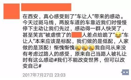 今年5月初以来,在市委、市政府的大力倡导下,在全市各行各业的积极参与下,在您的主动配合下,“车让人”在我市的大街小巷已经越来越普及,成为古城西安街头一道靓丽的风景线。作为生活在西安的您,当听到别人谈起街头这些不再是罕见现象的停车礼让时,您必定会感到自豪,因为,她确实发生了。西安,也成为了网友口中的“别人家的城市”!