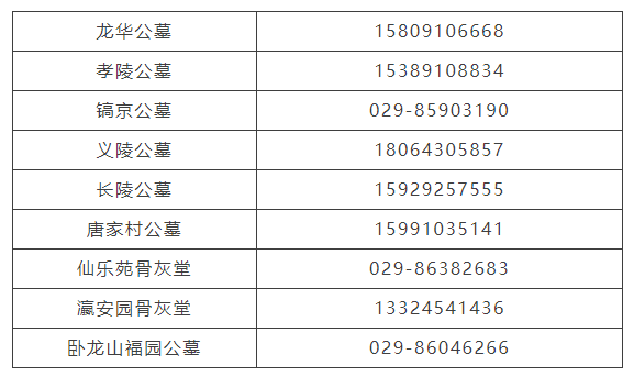 西咸新区各殡葬服务机构(预约)电话: