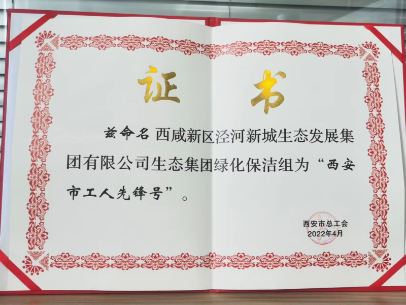 近日,西安市总工会授予了西咸新区泾河新城生态发展集团绿化保洁组“工人先锋号”称号。