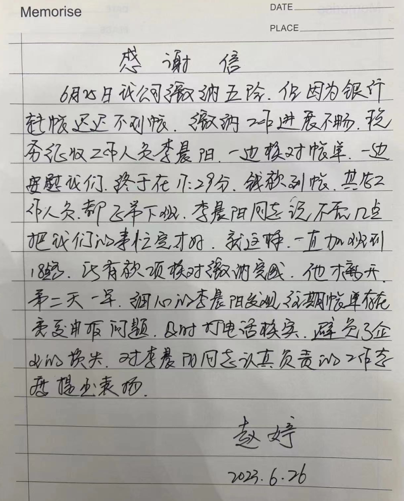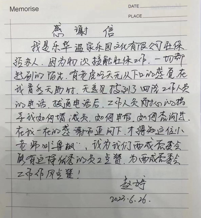 近日,泾河新城政务大厅收到辖区企业乐华温泉乐园文化有限公司赵女士的两封感谢信对政务大厅税务综合窗口和社保窗口工作人员认真负责的工作态度表示感谢。