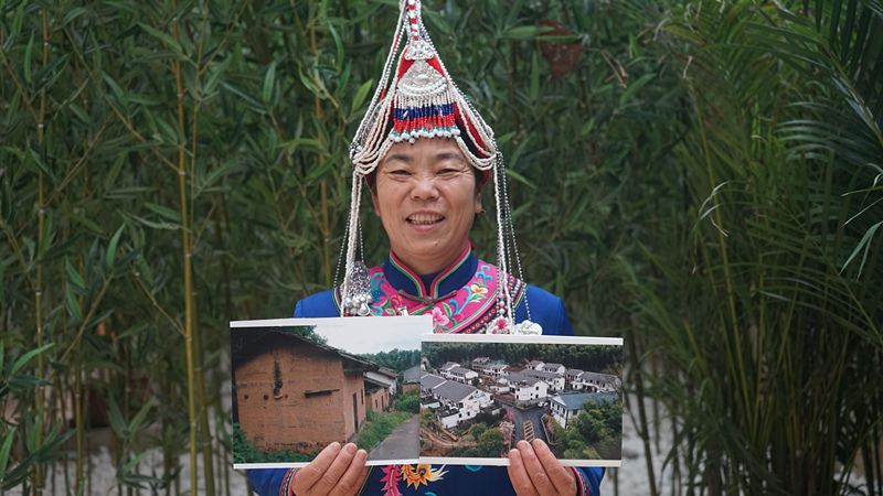 全国人大代表、江西省资溪县新月畲族村党支部第一书记兰念瑛拿着两张对比照片。