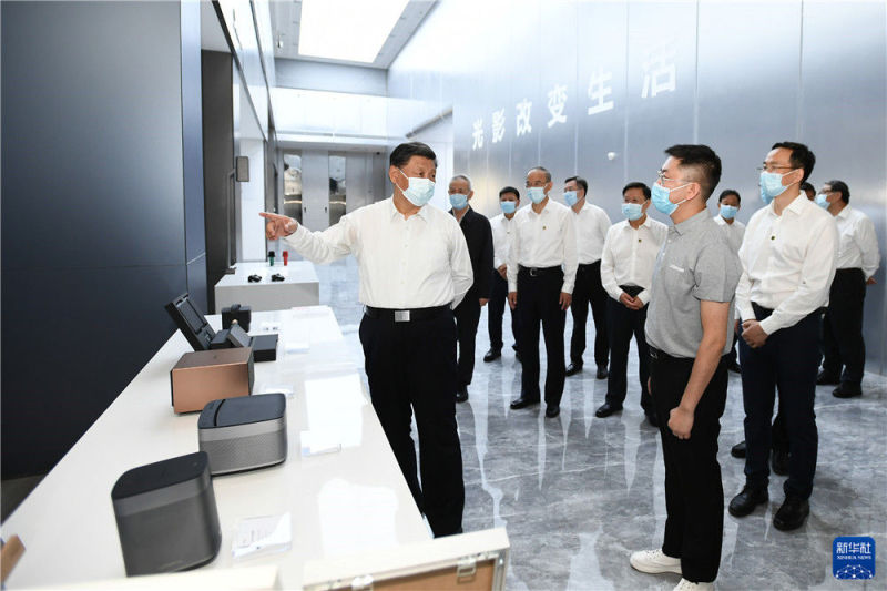 随后,习近平考察了极米光电有限公司。他走进公司展厅和生产车间,了解企业加强自主创新、产品研发销售、带动就业和当地支持民营经济发展、出台纾困帮扶政策等情况。习近平强调,推进科技创新,要在各领域积极培育高精尖特企业,打造更多“隐形冠军”,形成科技创新体集群。
