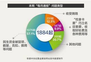 16次“每月通报”的1884起问题中,涉及民生资金被冒领、截留、克扣、挪用等问题共1076起,占57.1%。
