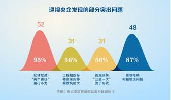 95%的被巡视央企存在纪律松弛、“两个责任”履行不力问题,存在“靠啥吃啥”、利益输送问题的央企有48家,占比87%。违规决策,工程招投标、物资采购腐败风险大问题分别为31家。