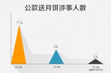 再看备受关注的公款送月饼问题。三年多来,公款月饼在礼品中仍占有一定比例,但下滑迹象明显。从此次梳理的155起案例看,2014年有11人,2015年4人,2016年(截至9月30日)仅2人。
