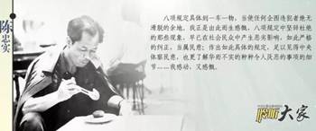 陈忠实:中央做出的八项规定,确实令我感动而且感慨。首先解决的是恢复我党的优良传统之一的群众路线,深入群众,调查研究,把每一种决策都建构在切实的可行性上。显然是针对近年间脱离群众华而不实盲目决策的弊病。再一点是八项规定具体到一车一物,当使任何企图违犯者绝无滑脱的余地。我正是由此而生感慨,八项规定中坚辞杜绝的那些现象,早已在社会民众中产生恶劣影响,如此严格的纠正,当属民意;作出如此具体的规定,足以见得中央体察民意,也更了解华而不实的种种令人厌恶的事项的细节……我感动,又感慨。