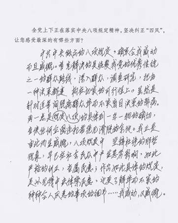 问:全党上下正在落实中央八项规定精神,坚决纠正“四风”,让您感受最深的有哪些方面?