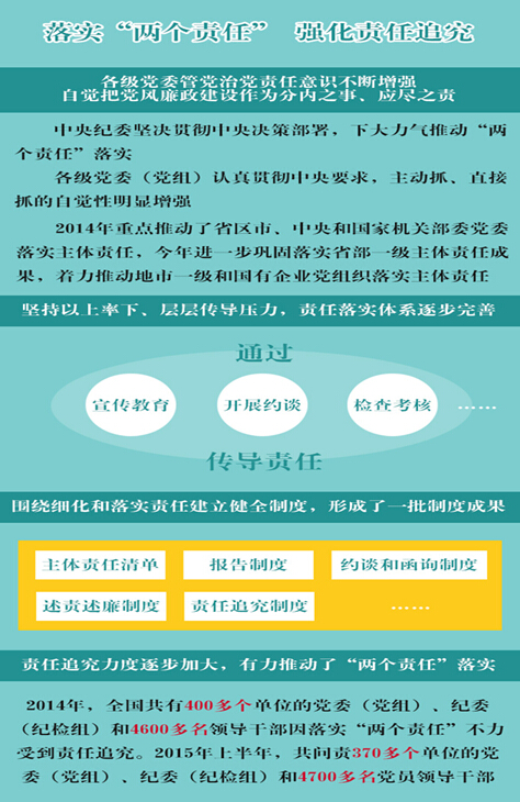 2014年,全国共有400多个单位的党委(党组)、纪委(纪检组)和4600多名领导干部因落实“两个责任”不力受到责任追究。2015年上半年,共问责370多个单位的党委(党组)、纪委(纪检组)和4700多名党员领导干部。2015年上半年责任追究总人数与2014年全年责任追究总人数大体持平。正在逐步加大的责任追究力度,倒逼“两个责任”落到实处。