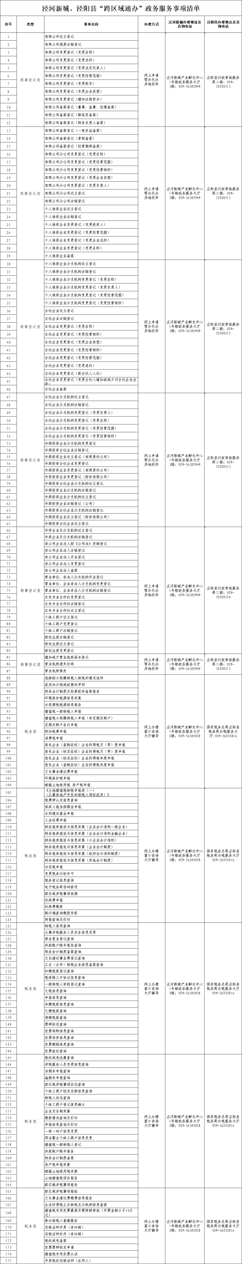 近日,西咸新区泾河新城与咸阳市泾阳县共同签署“跨区域通办”政务服务战略合作协议,实现数据共享、等效互认、高效办结。双方共同梳理了包含商事登记、税务等175项高频办理事项,详细清单如下: