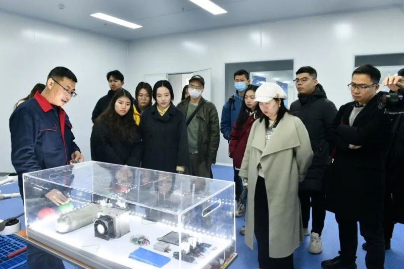 探访团在质子汽车科技有限公司参观燃料电池发动机,并与相关负责人围绕新能源商用车的发展和应用展开讨论。