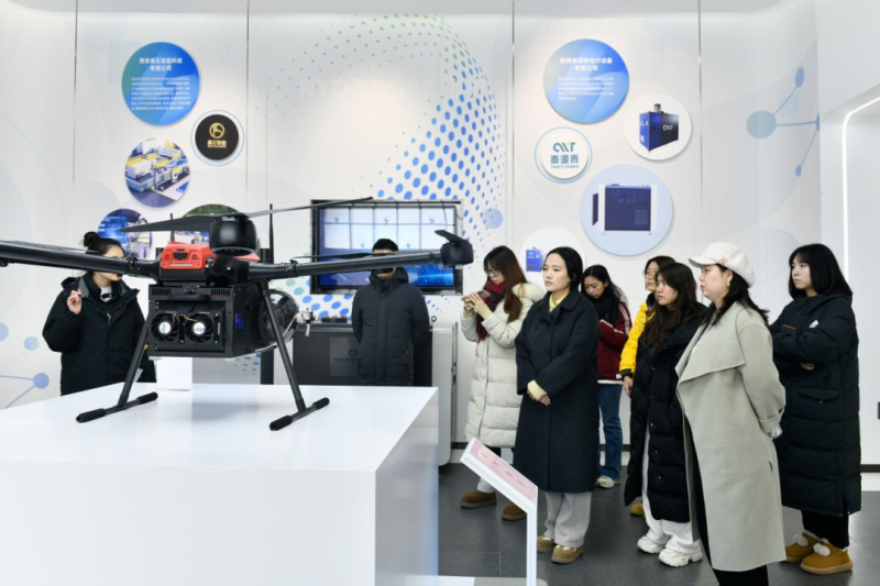 在泾河新城秦创原·氢合湾—氢能产业两链融合科创区展厅,参观入园企业盛世盈创氢能科技(陕西)有限公司研制的“烛龙一号”无人机。