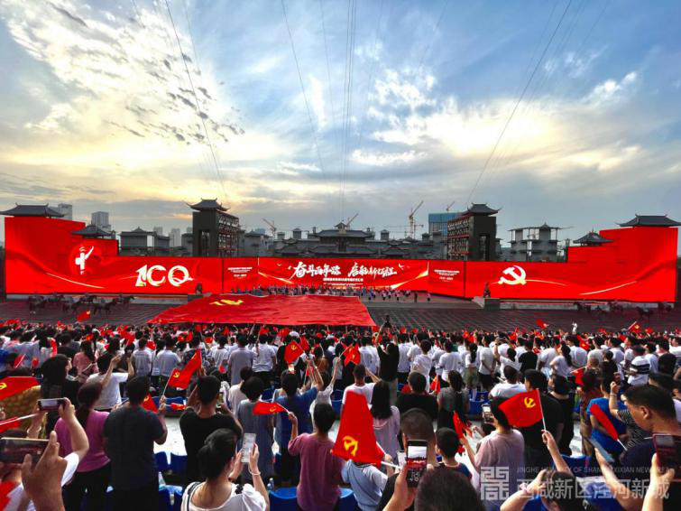 演出的最后,在全场观众高昂的《没有共产党就没有新中国》合唱声中,一面巨幅党旗在百余名护旗手的擎举中缓缓入场。全场欢声雷动,歌声震天,观众情绪高涨,将活动气氛推向最高潮。