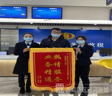 “热情服务,业务精通”。陕西泾阳弘丰建筑工程有限公司纳税人陈先生来到泾河新城政务大厅,将绣有这八个字的锦旗送给工作人员张蕾,对张蕾的暖心优质服务表示由衷感谢。