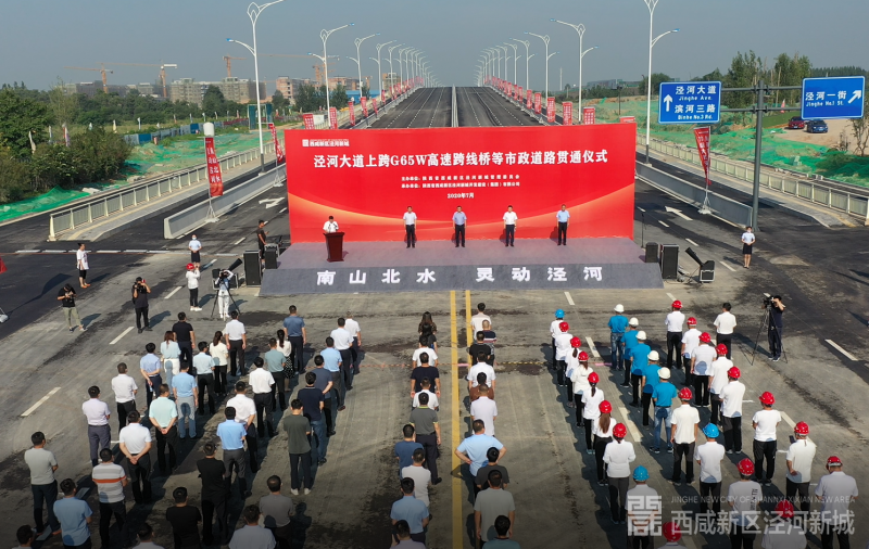 据了解,泾河大道上跨G65W高速跨线桥工程开工以来,一直受到社会各界的关注和重视,该桥是泾河大道的瓶颈,全长446.6米、宽42.5米,主要工程包括桥梁、道路、给水、电力管沟、照明、绿化等,是连接泾河大道东西两段的重要节点工程。该桥的通车,有力连接了崇文塔、茯茶镇两个景区以及即将投入使用的泾河新城第一中学,极大方便了辖区群众出行。此外,茶驼大道、泾干二街、瀛洲三街等市政道路也于当天正式贯通,使泾河新城“四纵四横”的交通网络更加完善,全面提升了区域交通环境。