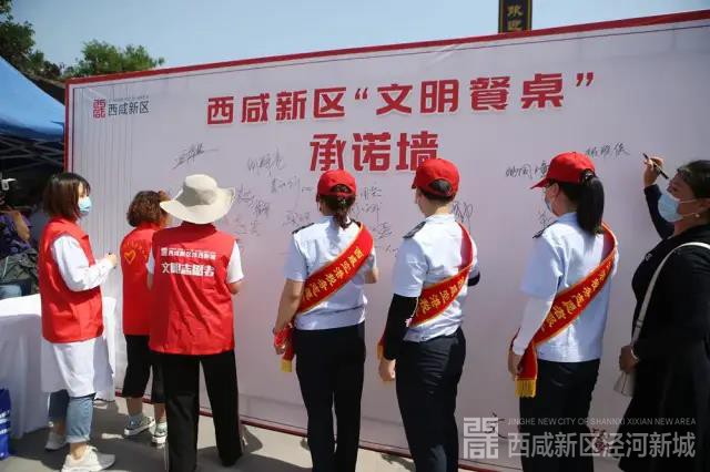 活动中,新区改创、市监、卫生等部门代表宣读了《陕西省餐饮服务业“公筷公勺分餐”行动实施指引》《陕西省餐饮业分餐制设计实施指南》《陕西省文明就餐健康指南》,餐饮行业代表、群众代表、志愿者代表共同宣读文明餐桌倡议。在场人员纷纷在承诺墙上签字,号召从自身做起,共同做到使用公勺公筷,做到卫生用餐;推行分餐分食,做到安全用餐;践行“光盘行动”,做到节俭用餐;树立环保理念,做到文明用餐。