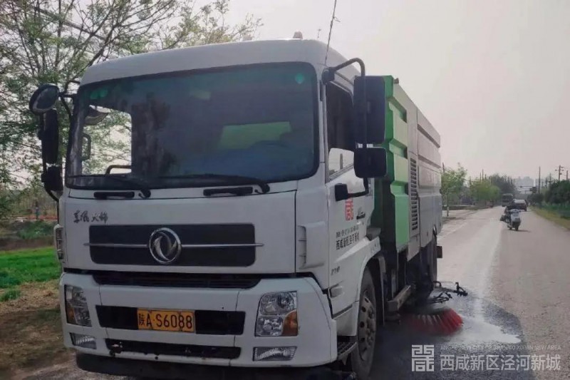 针对辖区城乡道路广场,泾河新城城市管理与交通运输局共出动大型机械洒水车15辆、湿扫车9辆,对新城主干道路、街头广场进行冲洗、湿扫作业,目前已完成200余处点位冲洗,达到路面见本色,无垃圾、无积尘、无灰带。同时,利用高频雾炮车3辆对新城范围的国道、省道、县道公路进行高频集中冲洗压尘,有效降低道路扬尘污染,提高空气质量。