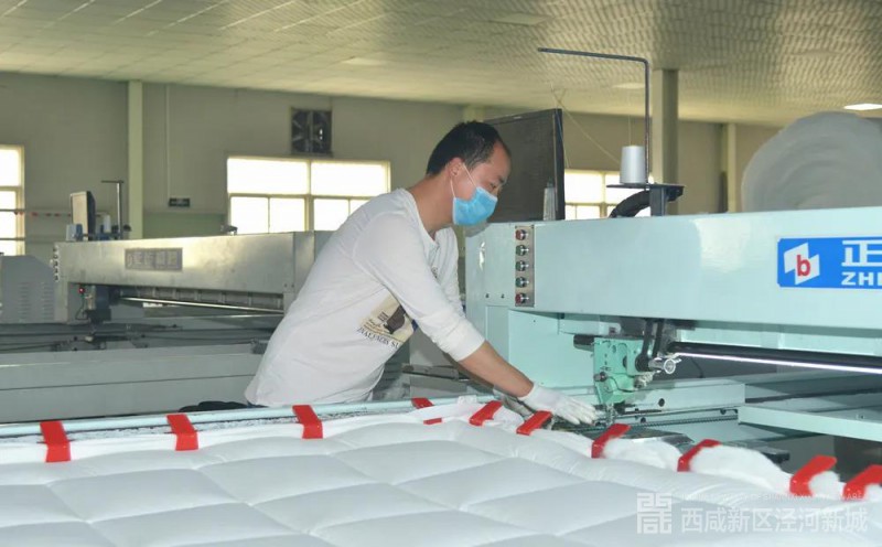 在陕西百年新业纺织品有限公司车间里,机器嗡嗡作响,工人们带着口罩正在忙碌。绗缝车间里,一位身穿白色T恤的小伙,正娴熟地将被褥扣上支架夹,送到绗缝机上。