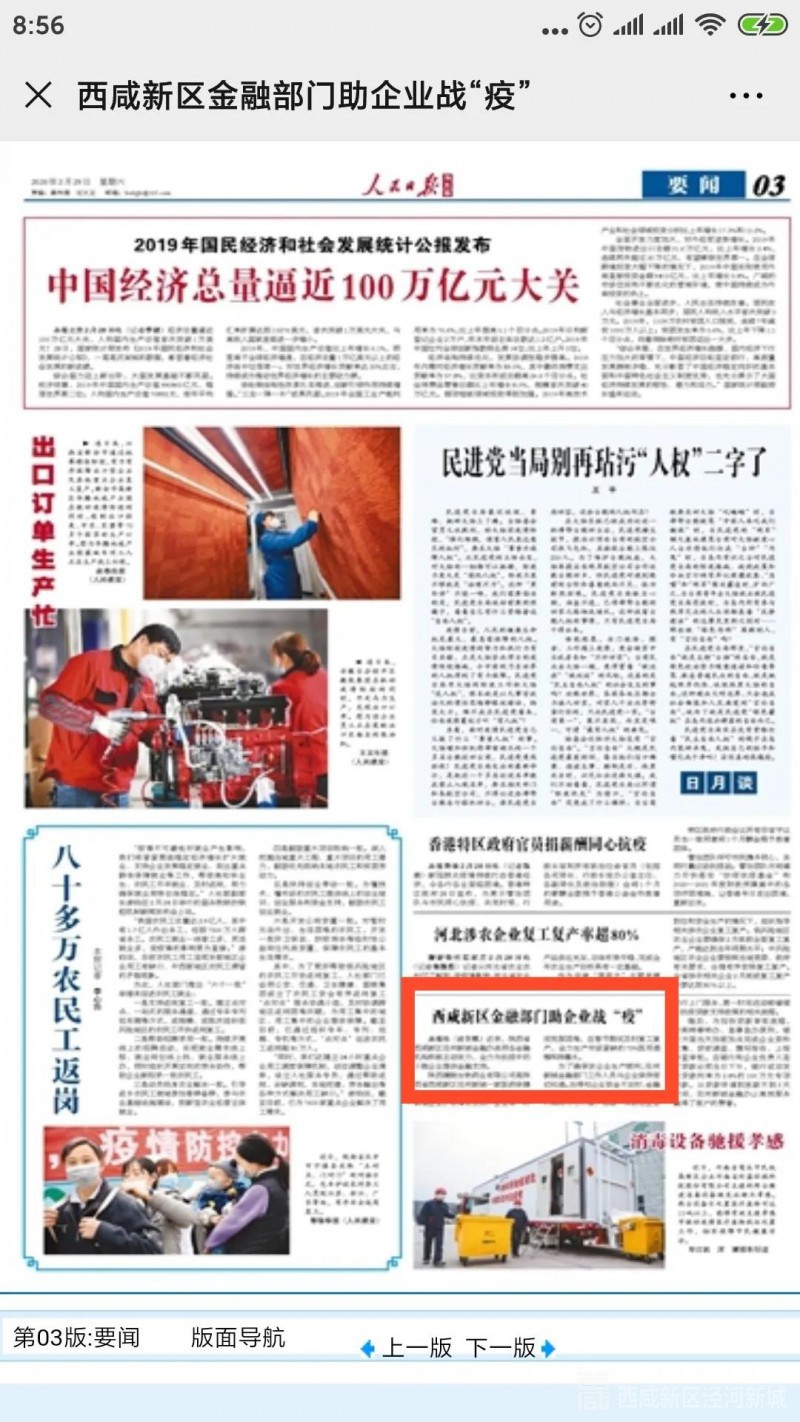 人民日报海外版,在3版要闻栏目以《西咸新区金融部门助企业战“疫”》为题,聚焦泾河新城金融办连同各金融机构积极主动发力,全力为抗疫中的小微企业提供金融支持,原文如下: