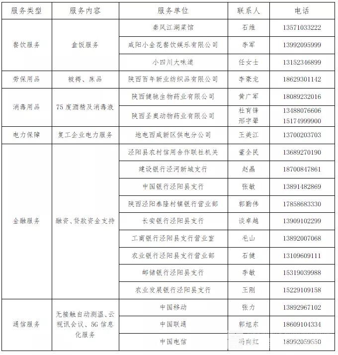 随着疫情防控工作的推进,泾河新城为全力支持企业恢复生产经营,做好复工复产服务保障工作,从餐饮、劳保、消毒、电力、金融、通信等领域,面向社会征集了一批保障服务单位,切实做好一手抗疫情,一手稳发展。