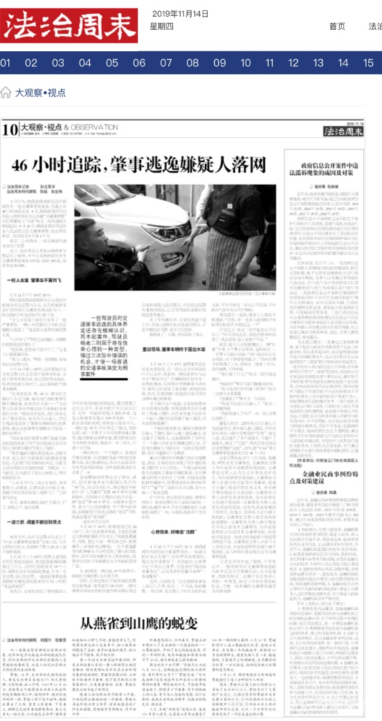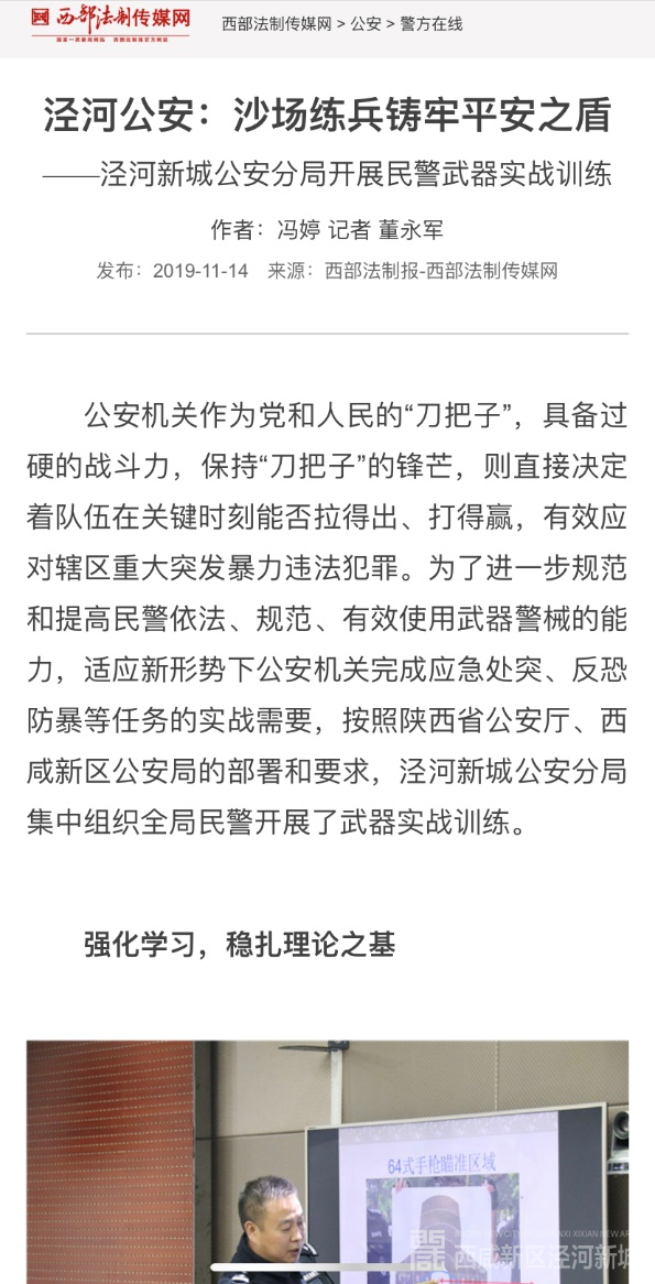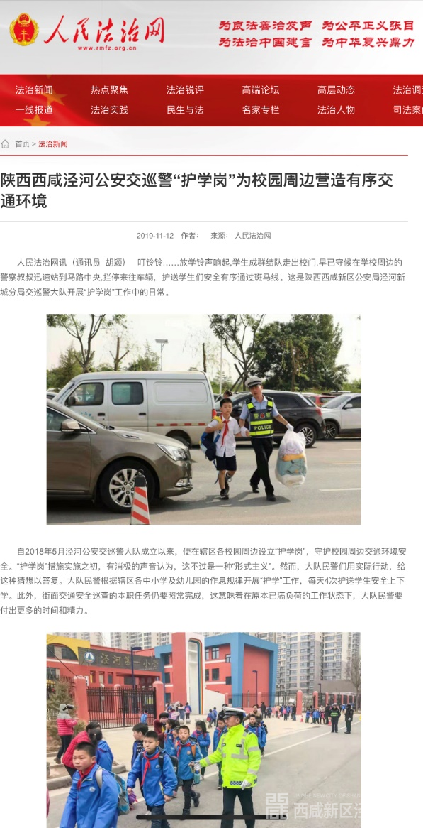 报道有深度、传播有广度的纸质媒体宣传平台,也成为泾河新城公安分局宣传主战场。对外,分局积极联络中、省、市各级纸质媒体,以“上大报、争头版、刊大稿”为目标,讲好警营故事,塑造警察良好形象。分局紧扣创建“枫桥式公安机关”这一重点工作,讲述分局做法经验。11月19日,《人民公安报》刊登了泾河公安做好矛盾纠纷化解、创建“枫桥式”公安机关经验做法;10月29日,《西部法制报》头版刊登泾河新城公安分局乐华城派出所“枫桥经验”工作调查文章《调通了民心,调顺了环境》;11月9日,《西部法制报》刊登泾河公安交巡警大队侦破交通肇事“顶包”案纪实文章《兄弟上演“调包计”民警拆穿西洋镜》;11月14日,中央级主流政经报《法治周末》大篇幅刊登泾河公安交巡警快破交通肇事逃逸案纪实文章《46小时追踪,肇事逃逸嫌疑人落网》;11月17日,中央政法委机关报《法制日报》再次刊发了该稿件,中央级报刊《法制日报》《法治周末》《人民公安报》对泾河公安工作事迹的宣传报道,传播级别高、面积广,是打造泾河铁军良好形象的又一力举。对内,分局加大信息报送力度,与各地兄弟公安机关积极交流经验做法,10月份《陕西公安》刊载泾河新城公安分局侦破黑社会组织犯罪案件经验事迹。一版版白纸黑字,一阵阵油墨清香,无不助力着泾河新城公安分局年终宣传更加有声有色。