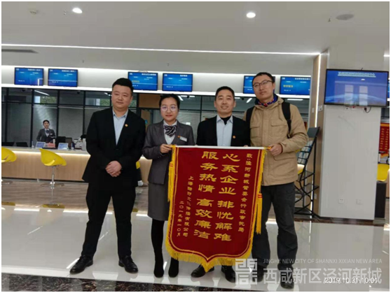 “我们公司之前没办理过这项业务,了解到可以在泾河新城政务大厅进行办理,由于时间紧急,自己也不太清楚办事流程,我们怀着忐忑的心情来到了政务中心的大厅。一进门,咨询台的工作人员就热情接待了我,告诉我去哪里办理户外广告门牌匾手续。办手续的时候,工作人员帮助我理顺了所有材料,并且得知我要办理的事项比较紧急的时候,加快加急为我办理,让我很感动,我也不知道该怎么表示感谢,想来想去,今天特意来给咱送面锦旗!” 上海酷野文化传播有限公司的负责人说。