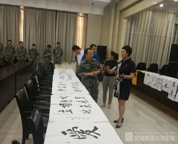 慰问中,任炳群还参观了泾河新城人社民政局与西安市农民书画协会西咸分会共同举行的“走进军营庆八一”书画展,“爱国”、“军魂”、“天行健君子以自强不息”……一幅幅书画作品,不仅活跃了部队的文化氛围、丰富了部队的文化生活,更是人民对子弟兵为了国家稳定和地方发展做出奉献的感谢,同时也蕴含着对军队建设发展的殷切期望。