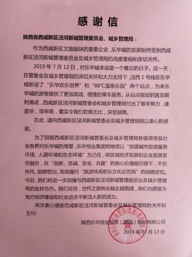近日,陕西乐华恒业投资(集团)股份有限公司派代表专程来到泾河新城城乡管理局,将一面印有“亲商助企,服务为民”的锦旗和一封情真意切的感谢信亲手送到城乡管理局相关负责人手中,一边表示对泾河新城协调公交车、方便游客、助力企业发展一事的感谢,一边表达了在泾河新城投资兴业的信心和决心。