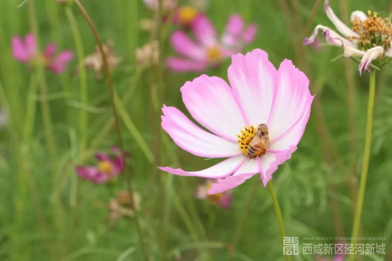 它总是会招惹蝴蝶、蜜蜂在花间嬉戏,花开似海,却又并不浓艳,天然的野性造就了波斯菊别样的美丽。它们并不被束缚成整齐的行列,长势就这样自然而肆意那样的张扬和热烈、灿烂和明媚。