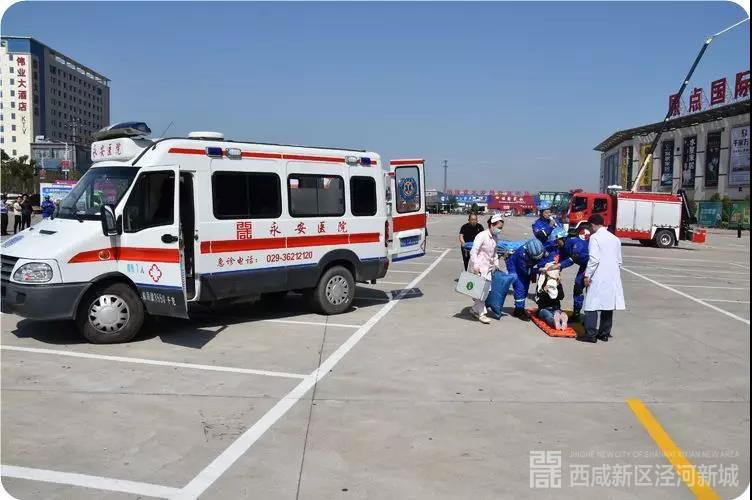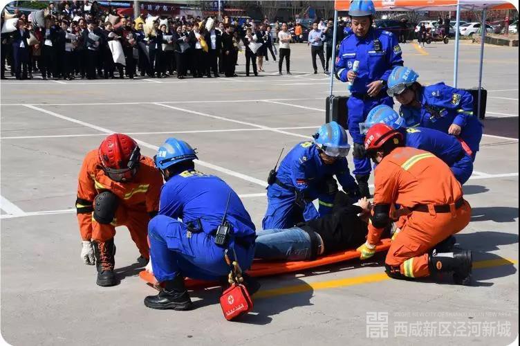 仪式结束后,新区组织了模拟地震引发火灾、安全疏散逃生和人员被困为主题的应急救援演练,泾河新城消防大队联合蓝天救援队和明珠家居消防队各方协作,配合默契,演练过程紧凑有序、环节全面、真实高效;蓝天救援队专业人员还现场开展包括骨折、外伤包扎以及心肺复苏医疗急救演示。