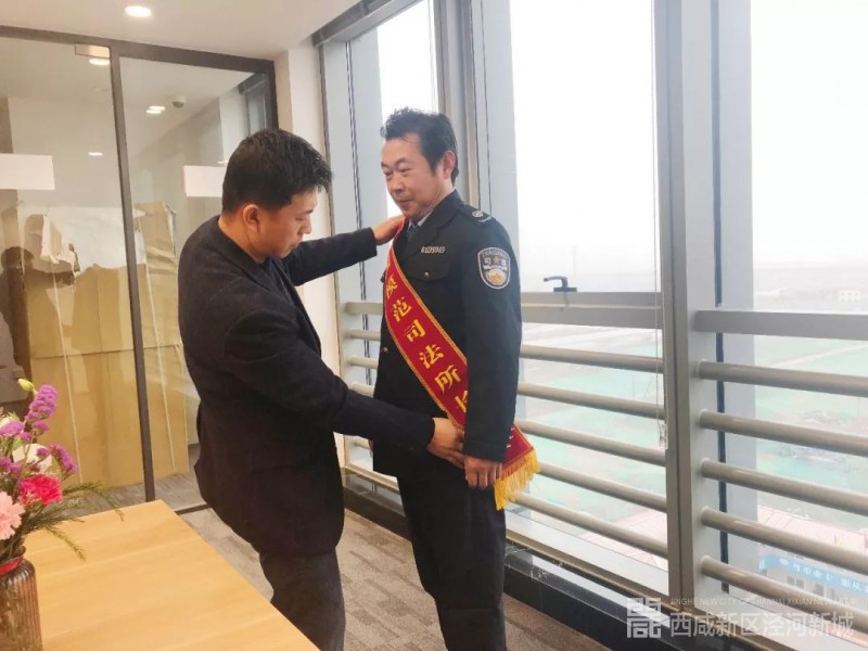 1月30日下午,司法部召开全国司法行政系统表彰大会(电视电话会),泾河新城永乐司法所所长周正荣喜获“全国模范司法所长”称号,并且成为新区唯一获此殊荣的司法所长。会后,西咸新区综治局副局长张洪波按照会议安排向周正荣授予荣誉绶带。