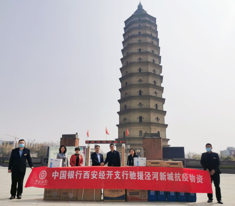 3月22日,中国银行西安经济技术开发区支行由行长杨万勇带队,组织调配货源,为泾河新城送来消毒液、防护服、N95口罩、电动消杀喷雾器等抗疫物资,泾河新城党委委员、管委会副主任寻心乐参加捐赠仪式。