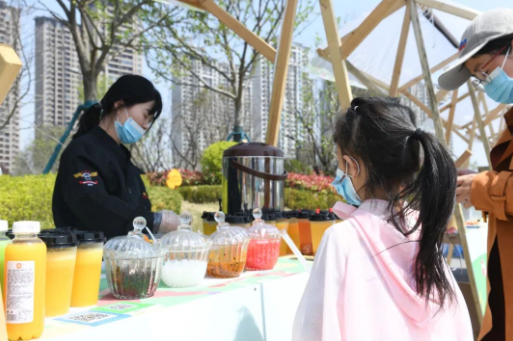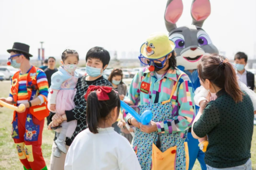 活动现场,熊猫、可妮兔等人偶造型激发了小朋友们的热情,他们在人偶周围嬉戏、玩耍、合影留念;家长们在错落放置的帐篷里休憩,闲赏春日泾河。此外,主办方设置的“味蕾美食街”也让现场家长和小朋友大饱口福。